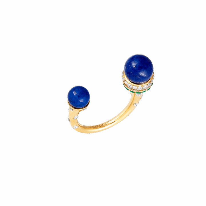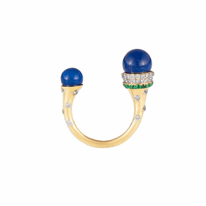 Construction: 18k gold is sculpted into an open hoop, set with full-cut diamonds, which represents a trumpet ensemble crowned with lapis horns—each consisting of a diamond-encircled peg-set lapis bead. Gold rings encrusted with emeralds complete these earrings from Meroh. CAD and CAM played a significant role in the design process, however, these pieces represent the culmination and confluence of handcrafted techniques, which extend to the filing, setting, and finishing—reflecting the hours of deliberation and care infused into each one.