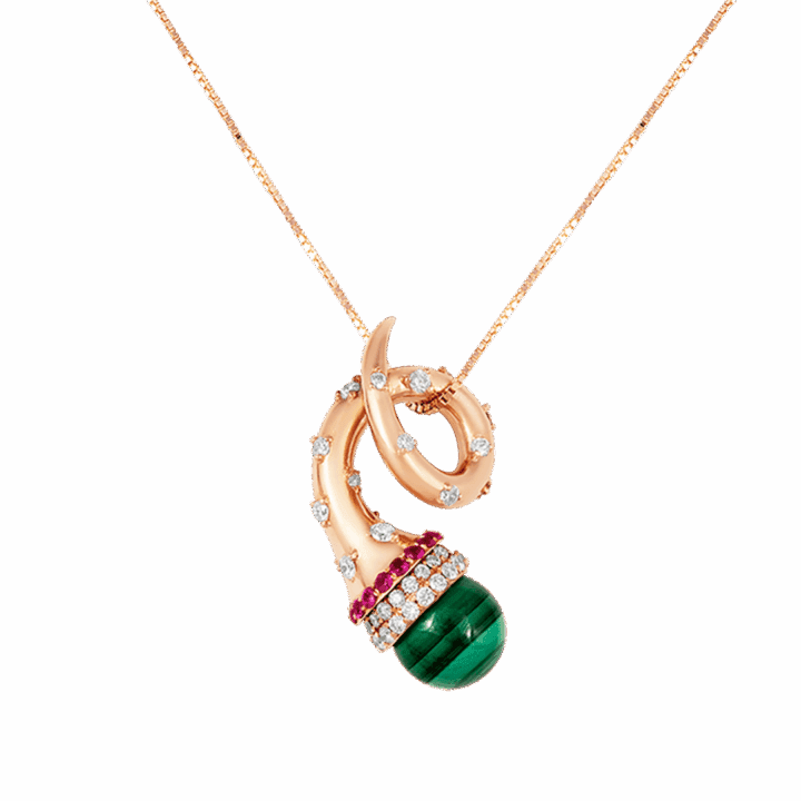 They glimmer and sparkle in the light, encircling and enriching their setting. The centerpiece—a peg-set Afghan Lapis or Congolese Malachite bead—is complemented by verdant emeralds or deep crimson rubies.