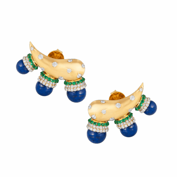 Construction : 18k gold is sculpted into an open hoop, set with full-cut diamonds, which represents a trumpet ensemble crowned with lapis horns—each consisting of a diamond-encircled peg-set lapis bead. Gold rings encrusted with emeralds complete these earrings from Meroh. CAD and CAM played a significant role in the design process, however, these pieces represent the culmination and confluence of handcrafted techniques, which extend to the filing, setting, and finishing—reflecting the hours of deliberation and care infused into each one.