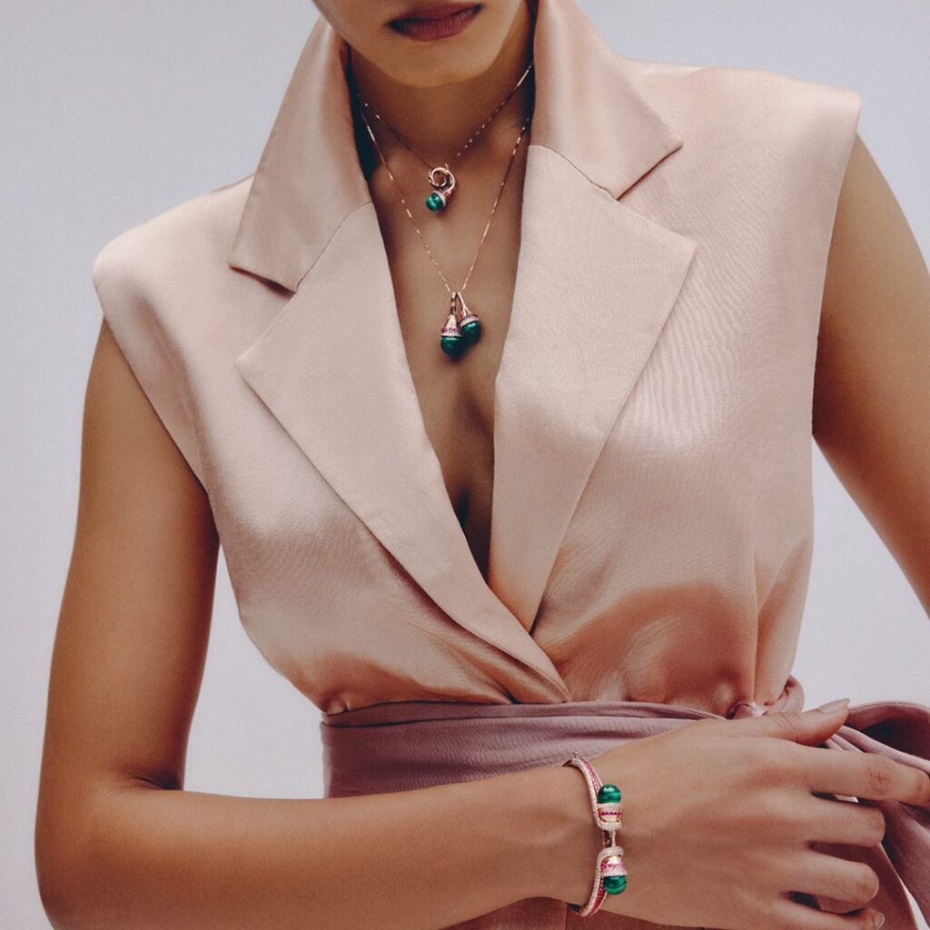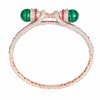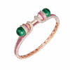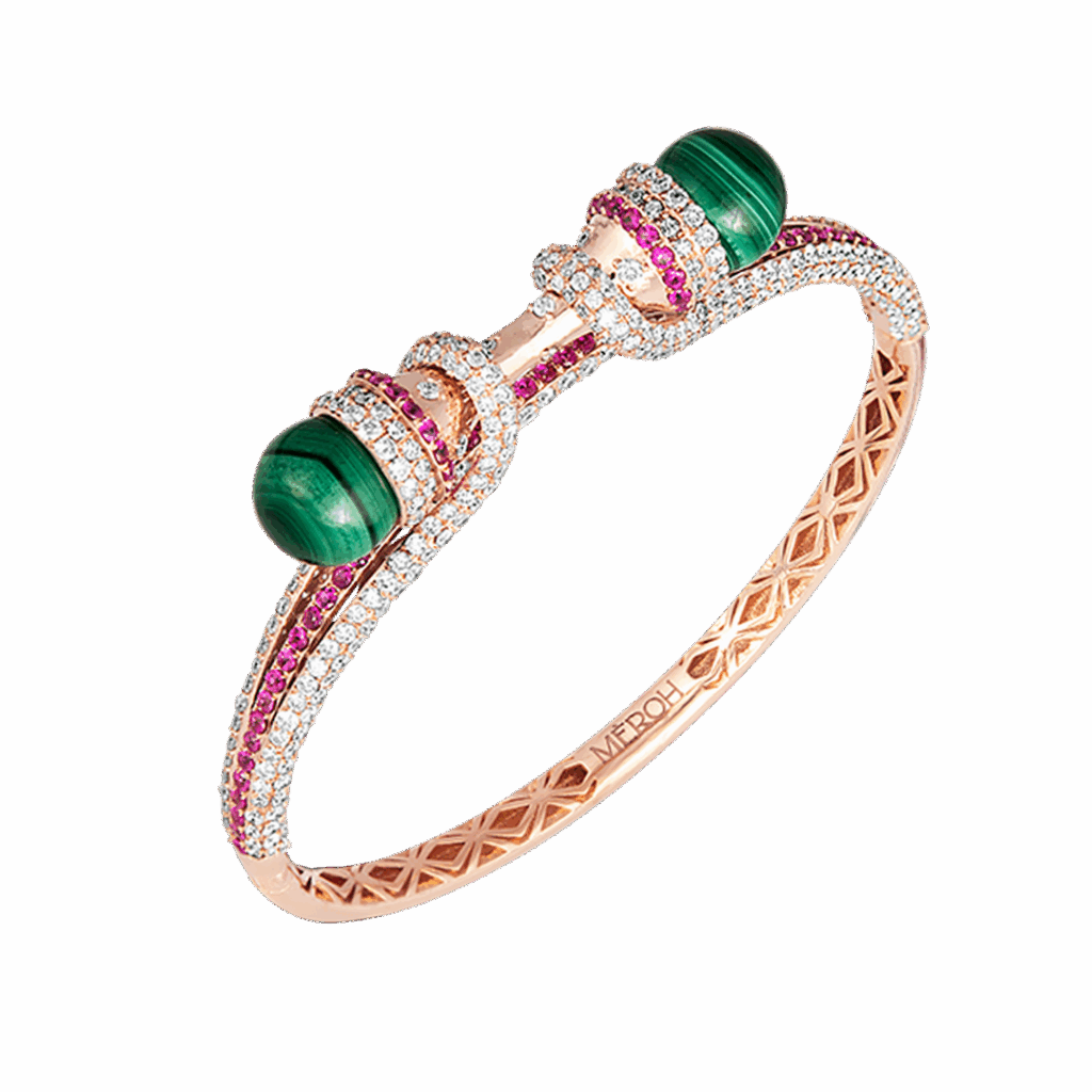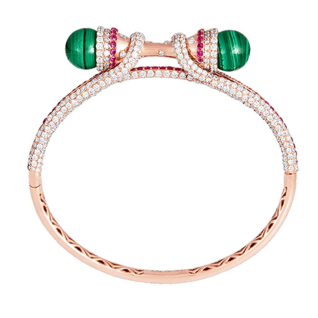18k gold is cast into an artfully-shaped bangle—set with full-cut diamonds and crimson rubies. Crowning each side of the motif are gold rings crusted with crimson rubies and brilliant diamonds, which are tipped with verdant malachite beads. CAD and CAM played a significant role in the design process, however, these pieces represent the culmination and confluence of handcrafted techniques, which extend to the filing, setting, and finishing — reflecting the hours of deliberation and care infused into each one.