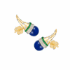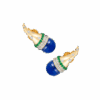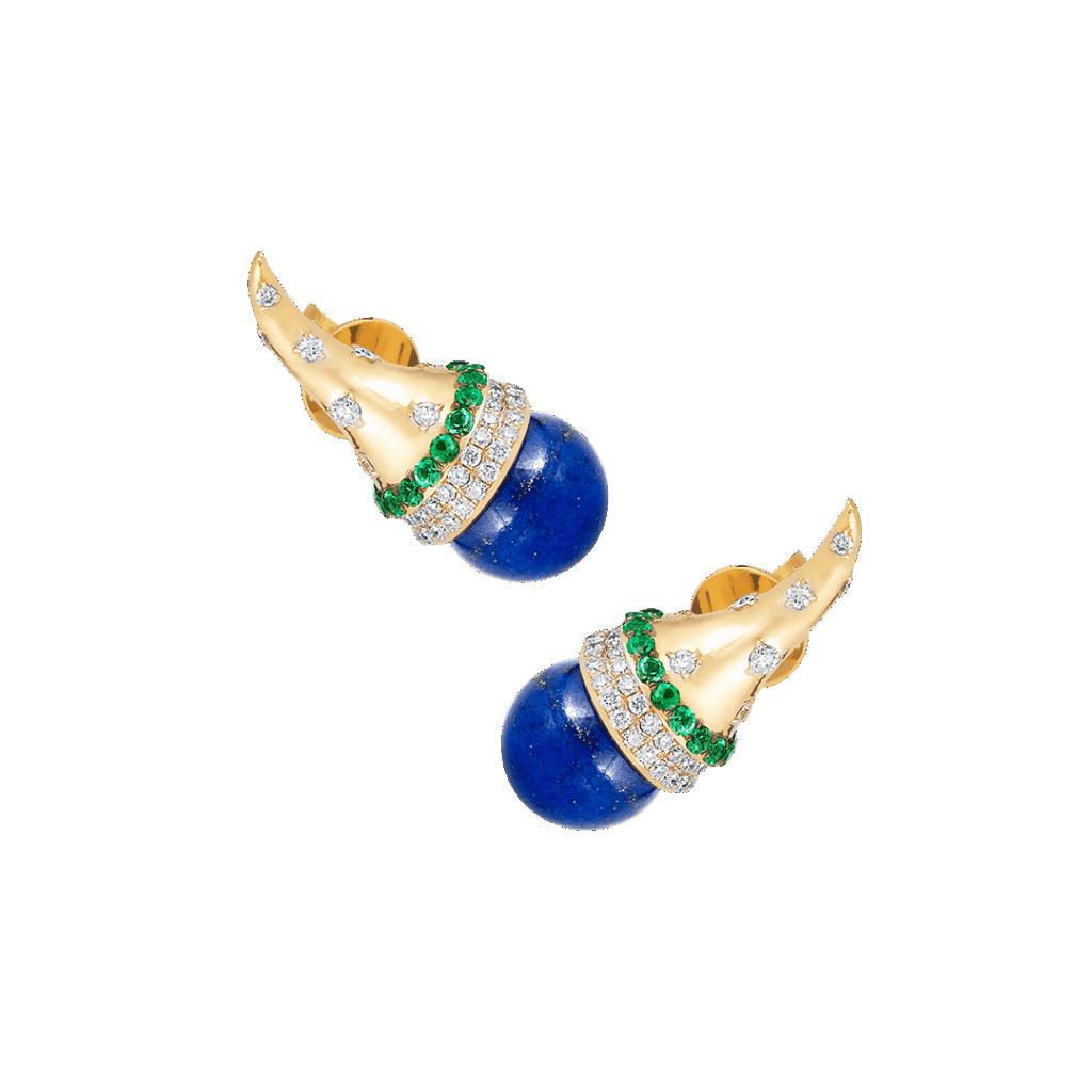 Sculpted from 18k gold and polished to a mirror shine, trumpets set with diamonds play their music through lapis motifs, which are drilled and peg-set to the end of each one. Crafted separately are two diamond and emerald-encrusted gold rings which are then attached to the pieces, completing these earrings from Meroh. CAD and CAM played a significant role in the design process, however, these pieces represent the culmination and confluence of handcrafted techniques, which extend to the filing, setting, and finishing — reflecting the hours of deliberation and care infused into each one.