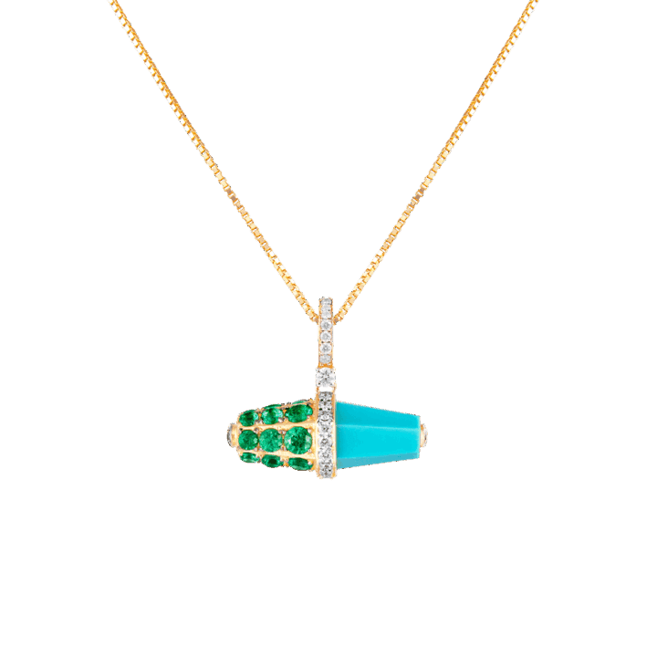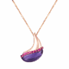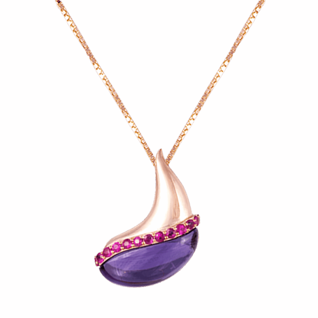 Sculpted from 18k gold and polished to a mirror shine, the piece holds an artfully shaped Amethyst at its heart, encircled by pavé-set Rubies. A chain of 18k gold links completes this necklace from Meroh. Though CAD aided in the design process, the final creation is rooted in handcraft — from the shaping and filing of the gold to the precise setting of each stone — reflecting the care and intention behind every detail.