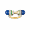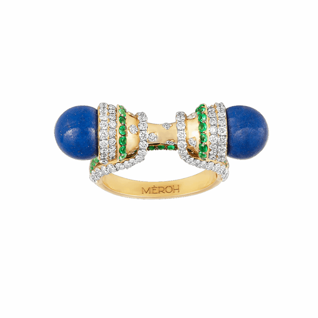 18k gold is sculpted into a unique band— pavé-set with full-cut diamonds and crowned by diamond-encircled peg-set lapis beads. Gold rings encrusted with emeralds complete this ring from Meroh. CAD and CAM played a significant role in the design process, however, these pieces represent the culmination and confluence of handcrafted techniques, which extend to the filing, setting, and finishing — reflecting the hours of deliberation and care infused into each one.