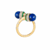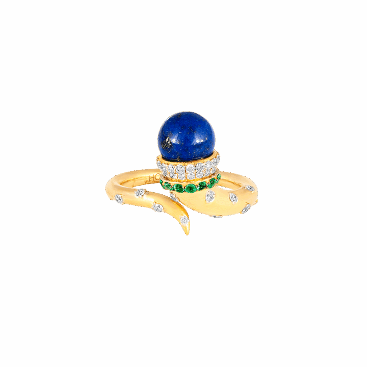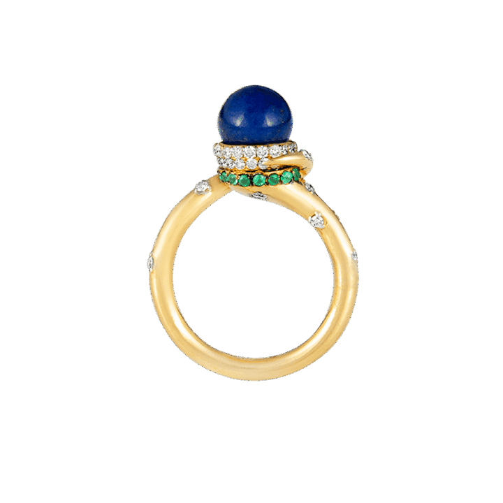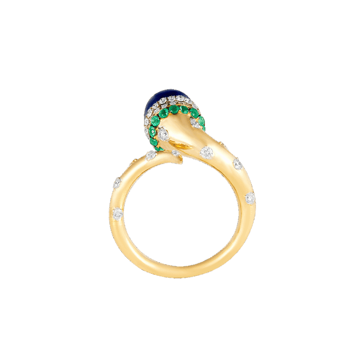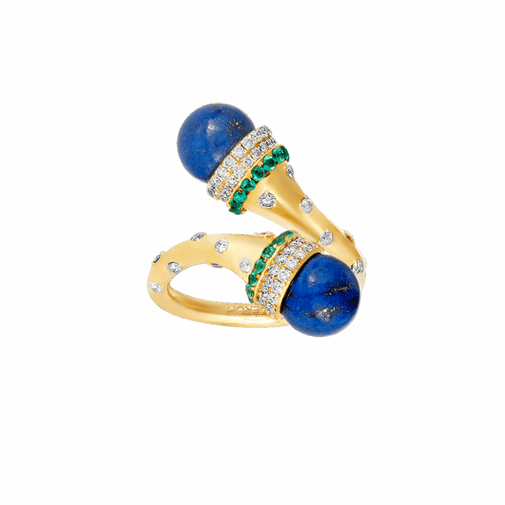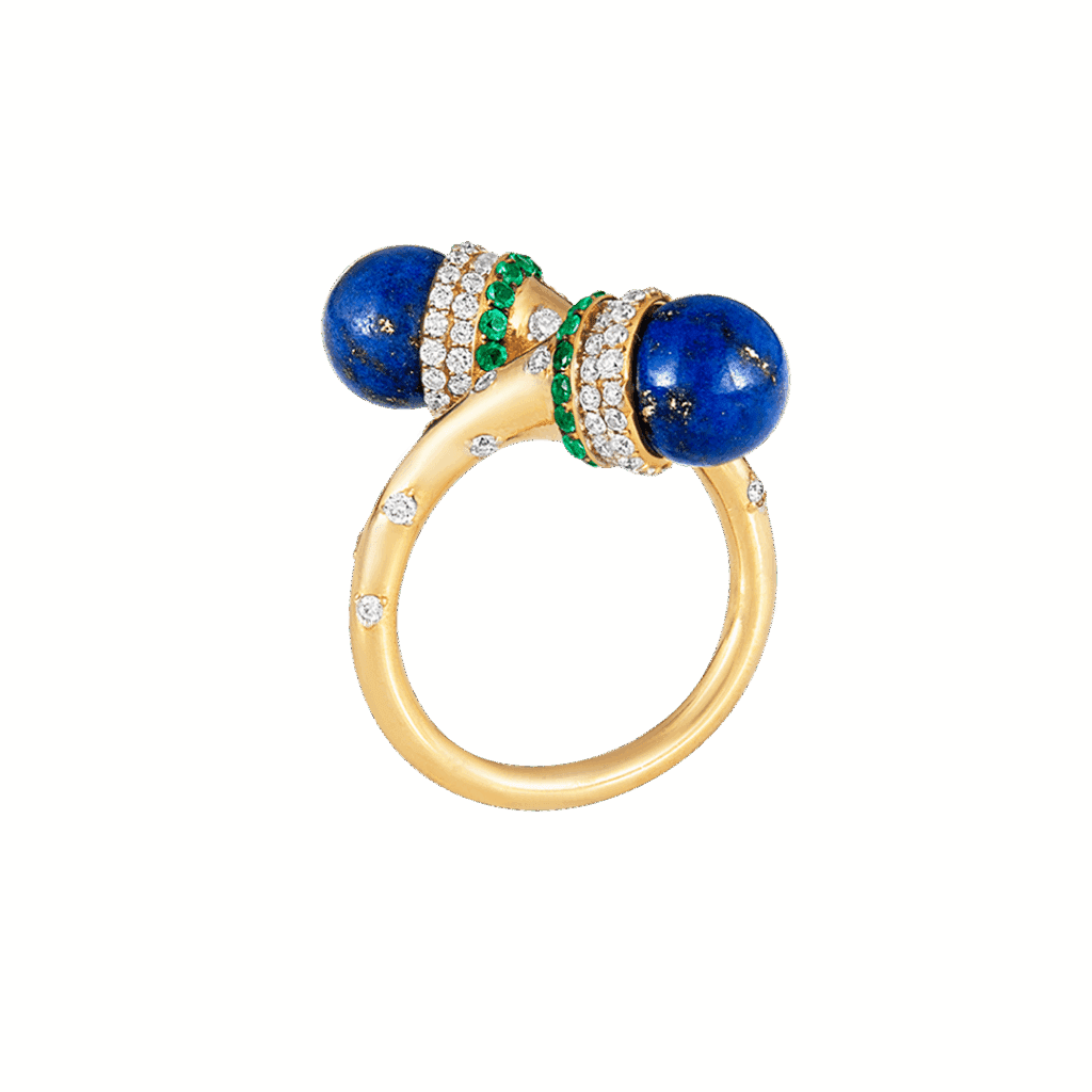 18k gold is sculpted into a twisting trumpet— set with brilliant full-cut diamonds, and crowned by a peg-set lapis bead. Gold rings encrusted with diamonds and emeralds are placed on each end of the horn motif, circling the bead, completing this ring from Meroh. CAD and CAM played a significant role in the design process, however, these pieces represent the culmination and confluence of handcrafted techniques, which extend to the filing, setting, and finishing — reflecting the hours of deliberation and care infused into each one.