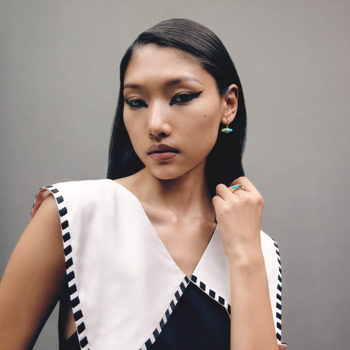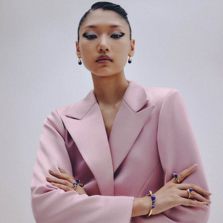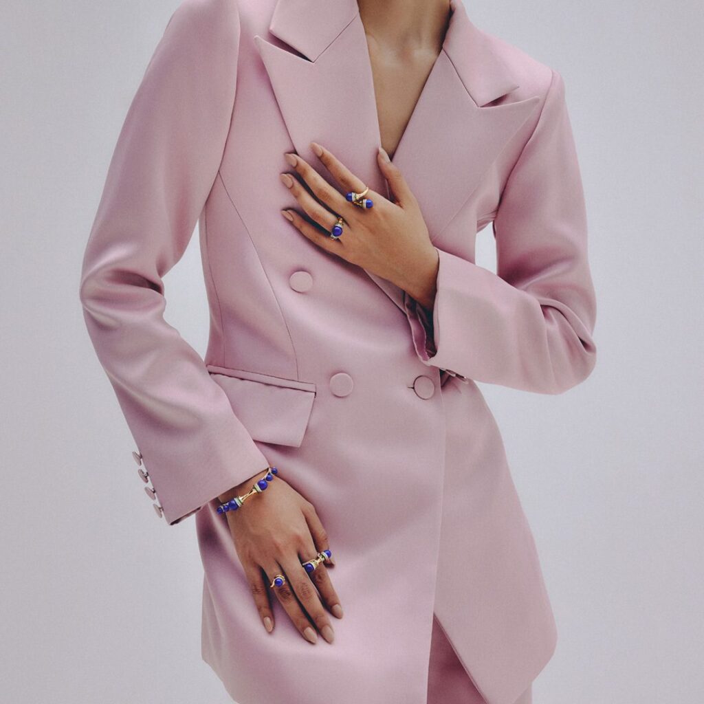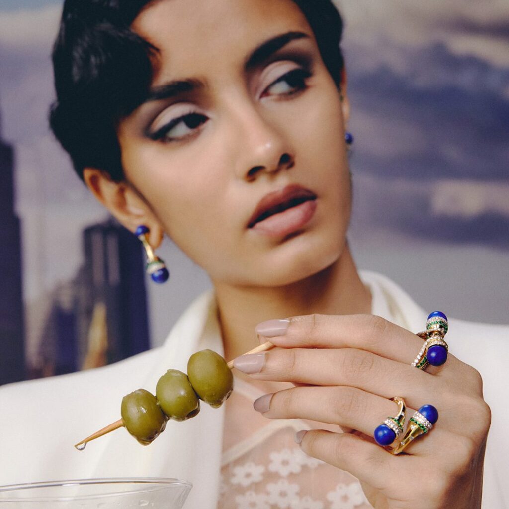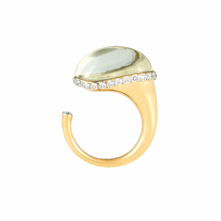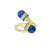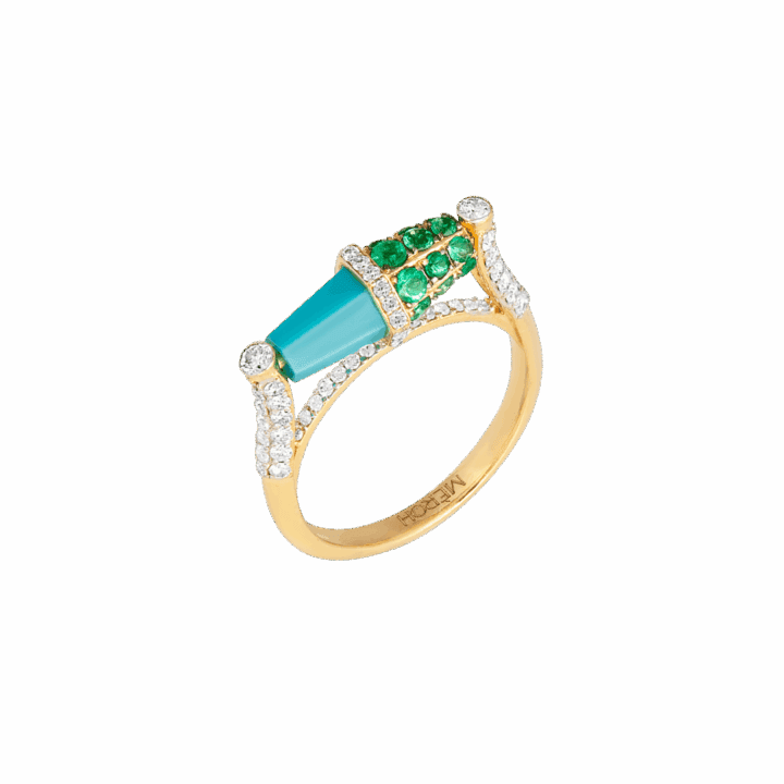 18k gold is sculpted into a twisting trumpet— set with brilliant full-cut diamonds, and crowned by a peg-set lapis bead. Gold rings encrusted with diamonds and emeralds are placed on each end of the horn motif, circling the bead, completing this ring from Meroh. CAD and CAM played a significant role in the design process, however, these pieces represent the culmination and confluence of handcrafted techniques, which extend to the filing, setting, and finishing — reflecting the hours of deliberation and care infused into each one.